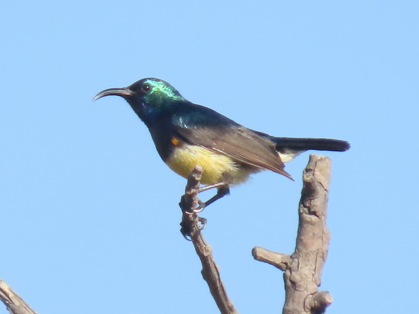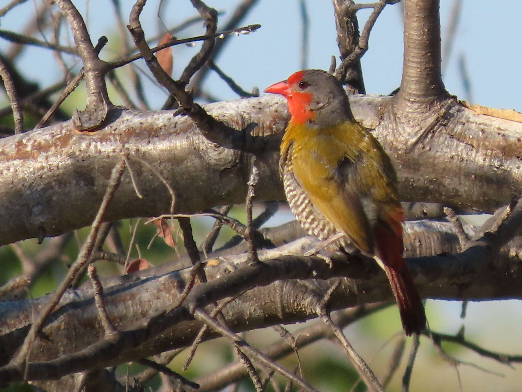 Near Amboiva, we birded in the only habitat we had not seen on previous trips to Africa, called miombo. This habitat is dominated by a few species of rather widely branched, flat-topped acacia-like trees. They form a fairly densely wooded savanna with minimal understory, which is the dominant habitat in a band across the continent from Gabon and Tanzania to Angola and Mozambique. Here we had excellent views of Green-capped Eremomela and I got a fleeting glimpse of the red, blue, and yellow Anchieta’s Sunbird.